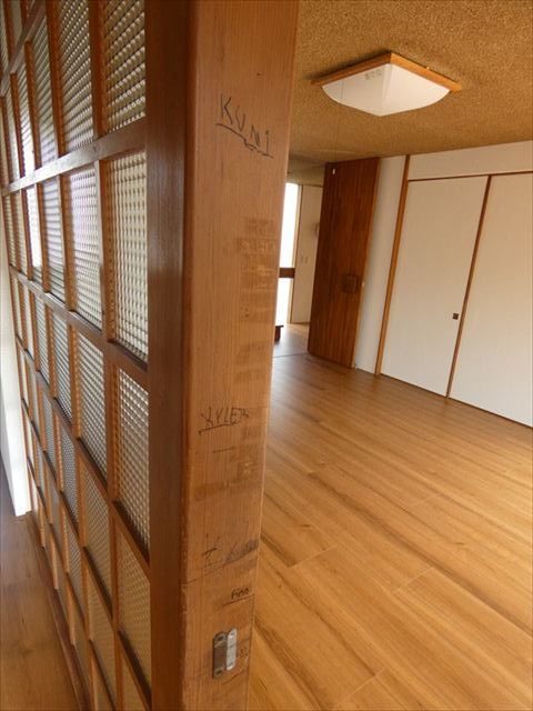 リビングとダイニングを区切る柱には、以前住んでいたお子さんたちの成長記録が残されています。なんだか温かい暮らしの記憶を感じますよね。クミちゃん、カイルくん元気してるぅ?