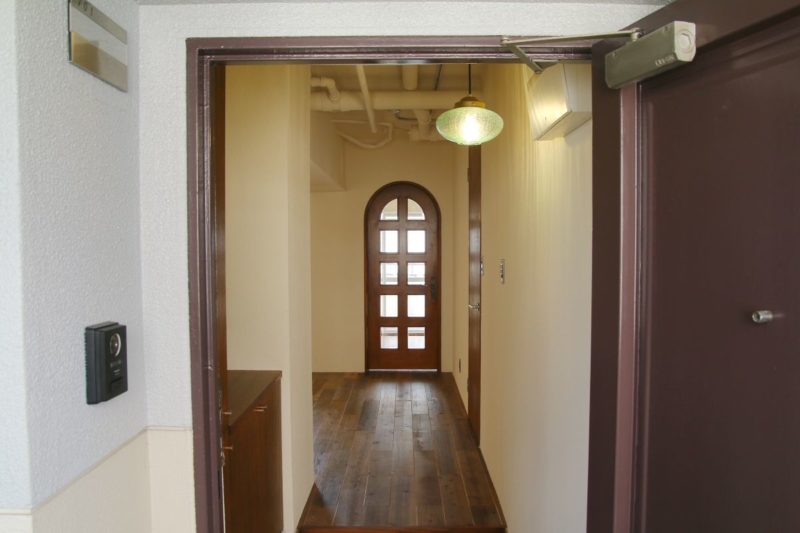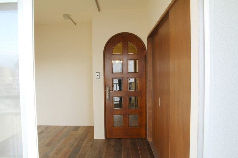 玄関の扉を開けると、まず迎えてくれるのはアーチ型の扉と、やわらかい光。