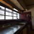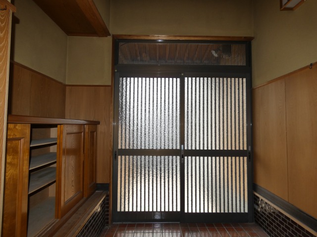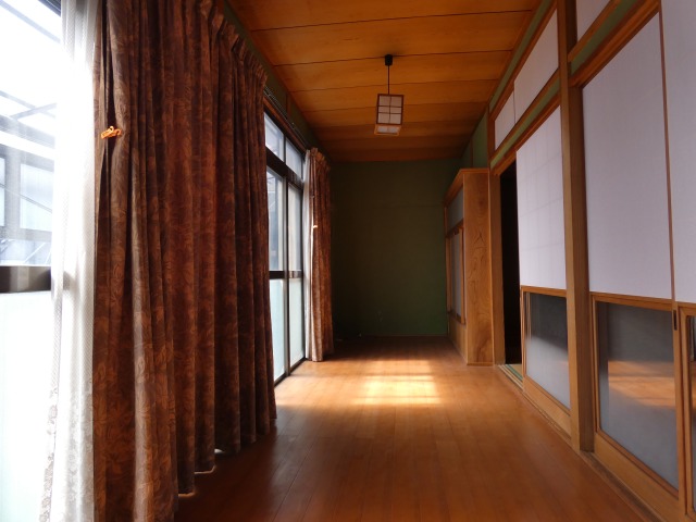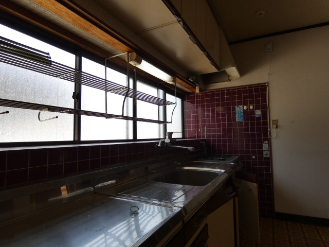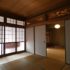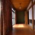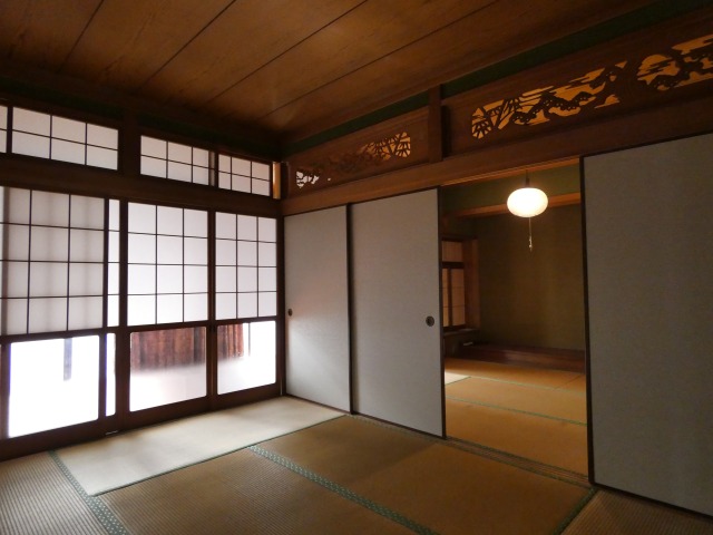 欄間のある和室、木の天井、赤いタイルのキッチン。